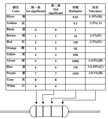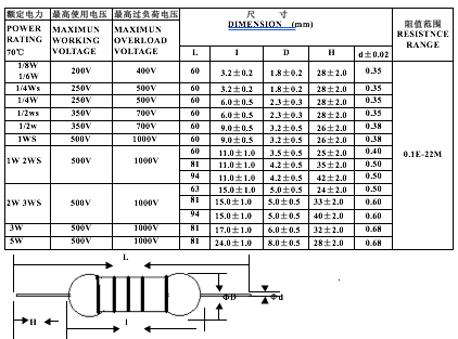 額定電力(W)以數字表示,如1/8W,1/6W、1/4WS、1/4W、1/2WS、1/2W、 1WS、1W、2WS、2W、3WS、3W、5WS、5W 2-3端子形狀 視其端子區分為P型、M型、F型 2-4特性 依據EIAJ-RC-2645或MIL-R-11804電氣特性為適用原則。 A、精密儀器類型 B、一般電器類 2-5公稱電阻值 Ω、KΩ為單位,依據JIS-C6402為選用原則( E-24Series ) 2-6電阻值及容許差