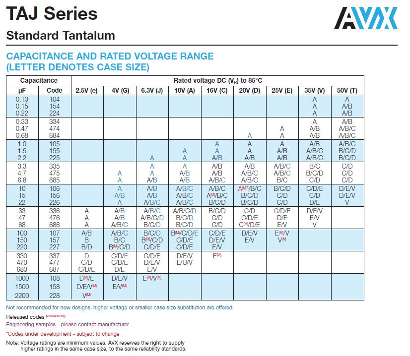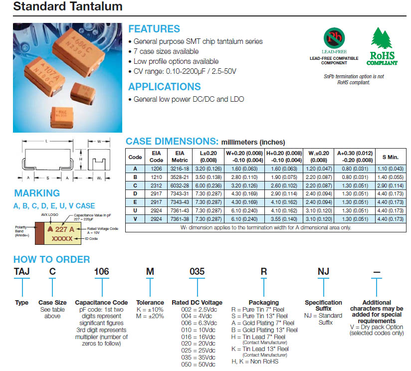 TAJ系列即標準品系列,AVX中最常用的一個系列,是AVX鉭電容中性價比最高,市場份額最大的標準品系列。